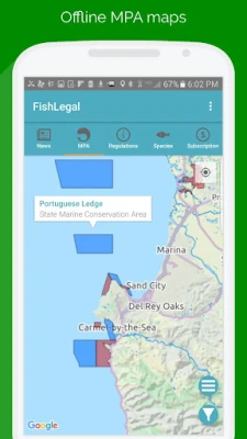Offline Maps for California Marine Protected Areas (MPAs). GPS enabled, know your exact location, where to fish legally and where to avoid! Designed by fishermen for fishermen. Completely offline capable, therefore use anywhere with or without cellular signal!