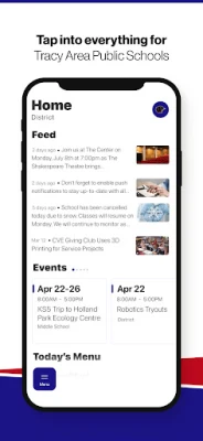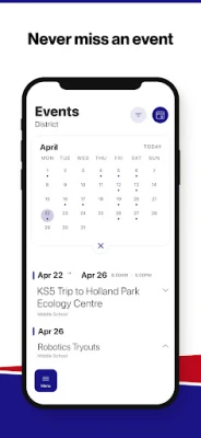 NEVER MISS AN EVENT The event section shows a list of events throughout the district. Users can add an event to their calendar to share the event with friends and family with one tap.